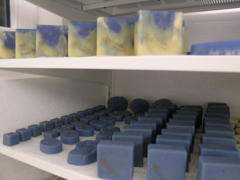 Mit dem Stempel wird jede Seife geprägt und wandert dann zur Reife ins Lagerregal.